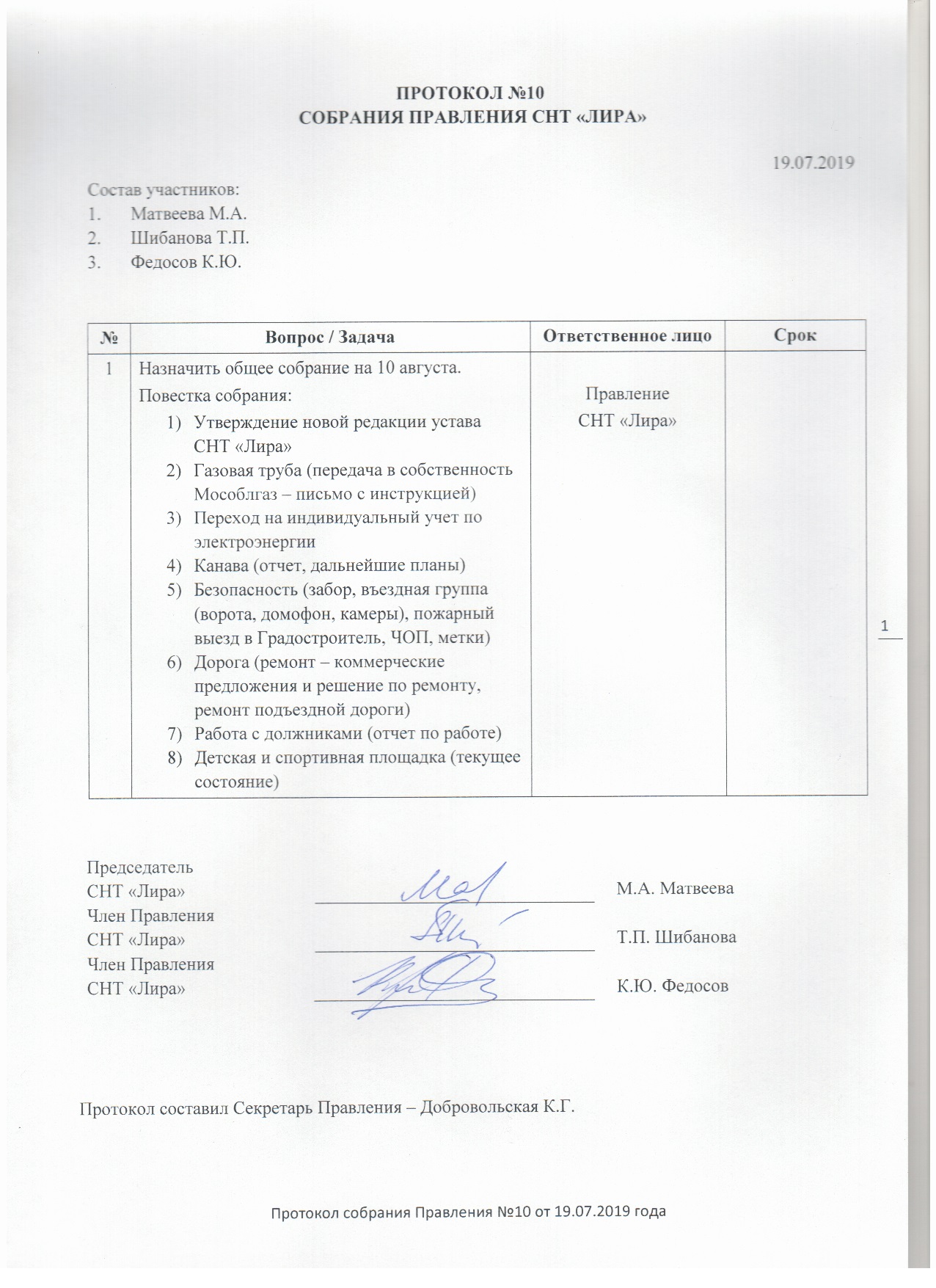 Протоколы Правления СНТ "Лира"